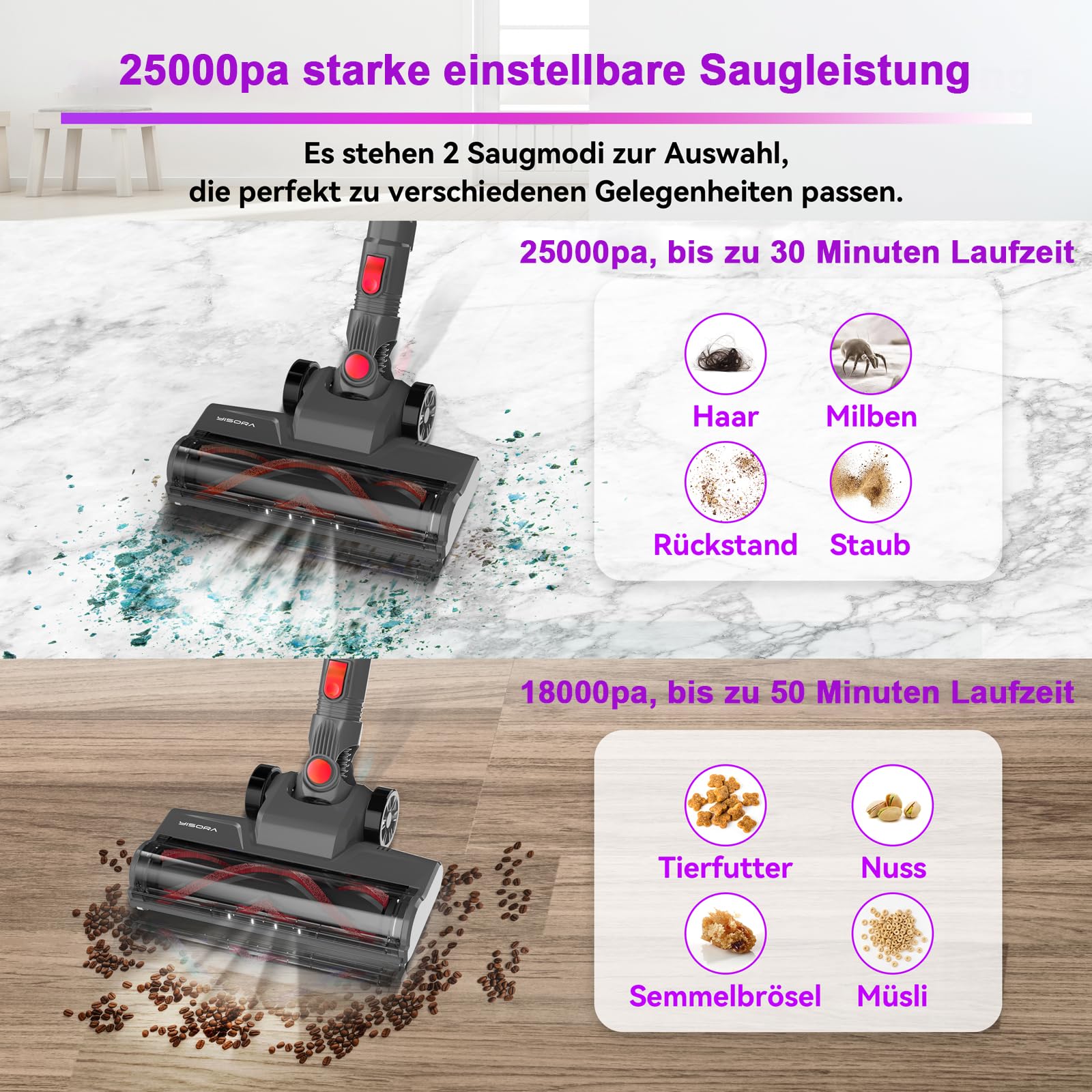Akku Staubsauger, 25000Pa/175W/50Min Staubsauger Kabellos, Anti-Tangle-Bürste und Selbststehend, Ultraleichter Handstaubsauger akku vacuum cleaner Stielstaubsauger für Teppichen, Hartboden, Tierhaare